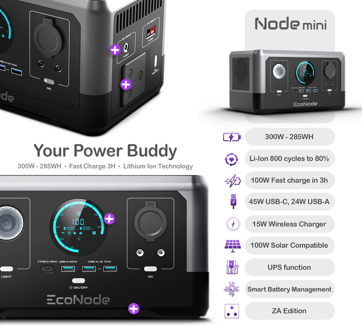 The EcoNode Nodemini is our smallest yet incredibly capable portable power station. Equipped with a 300W continuous and 600W surge power capability, it’s perfect for powering essential devices. Its efficient 100W fast charger ensures full charge within 3 hours, making it ideal for all loadshedding stages.