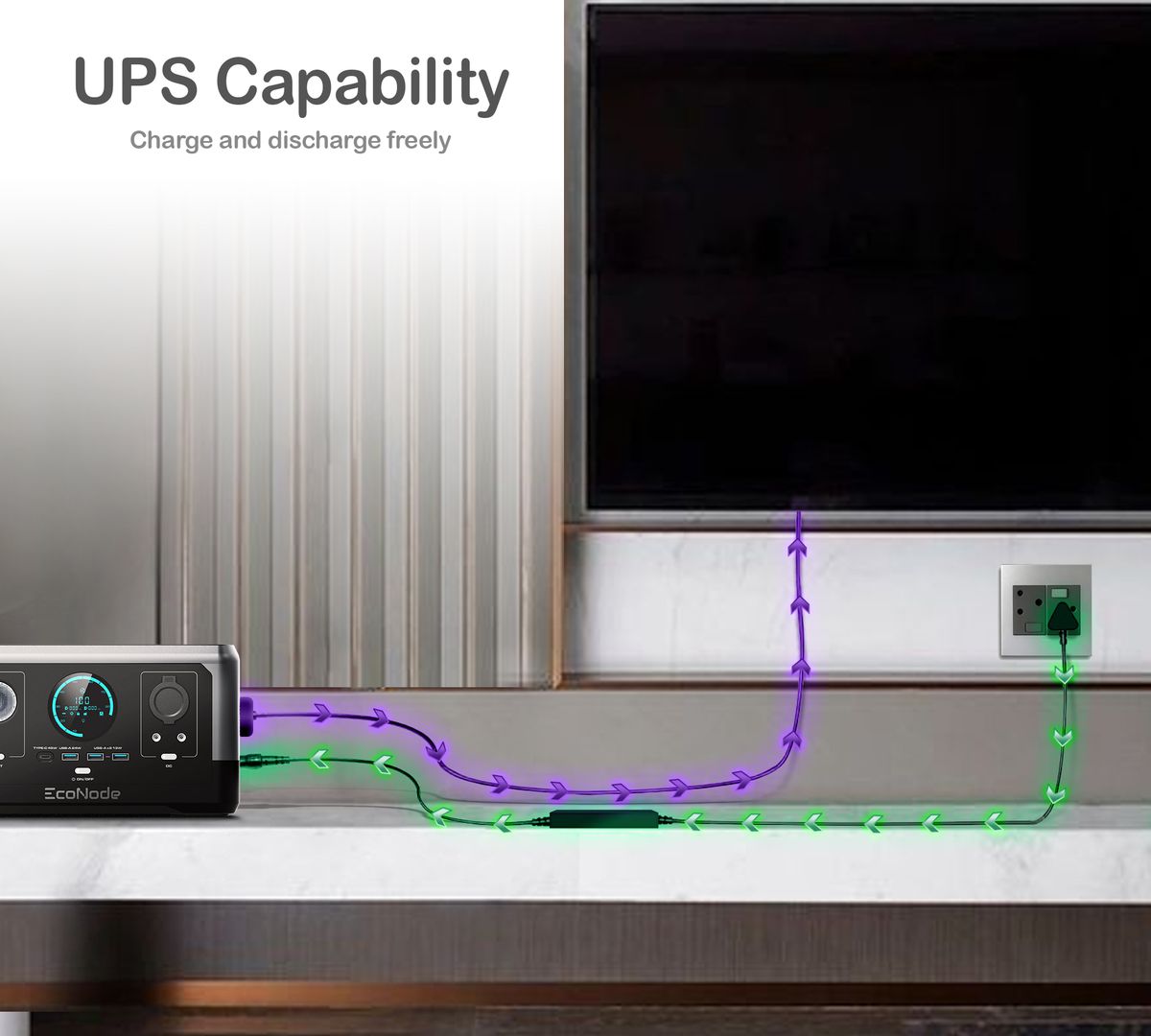 The EcoNode Nodemini powers your devices while charging its battery. If device power draw exceeds charging capacity, the battery may deplete. This is a standard operation for power stations and UPS devices, ensuring continuous power during outages. For optimal performance, be mindful of your device’s power requirements and adjust usage accordingly.